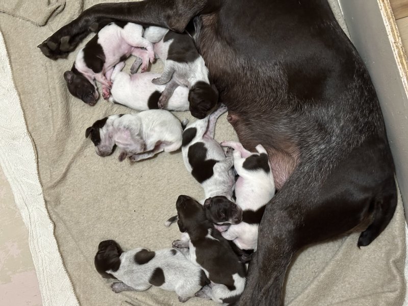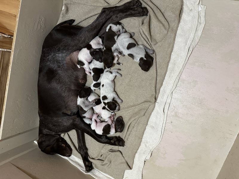 AKC registered Sire and Dam have champion bloodlines. Sire bloodline include Graf Vom Vehner Moor, one of the most titled in GSP history. Dam is from Westwind Kennel of Kansas and are highly sought after dogs. Sire and Dam are DNA tested for health and are negative for anomalies. Health is gauranteed. Pups are vet checked. Vaccines and wormings will be ongoing. Tails and dew claws docked. Applications for AKC registration will be provided. Photos of Sire and Dam will be provided upon request.