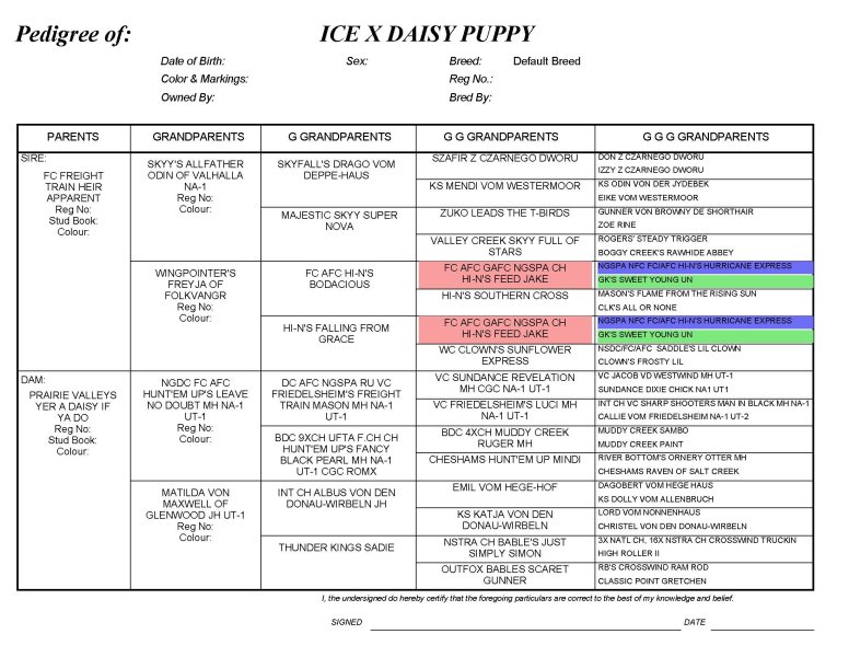 We have three males and two females up for discussion from our Ice x Daisy litter. This pedigree is loaded with VCs, FCs, NFCs, DCs, DK-KSs, and 8 Hall of Fame dogs: 3X NFC FC Rawhides Clown HOF, DC Odysseys Sam Saint Max MH HOF, FC Jigs White Smoke HOF, DC Hillhavens Hustler HOF, DC Essers Duke VD Wildburg, NGSPA NFC FC/AFC Hi-N's Hurricane Express HOF, NC FC KJ's Hightailing Saddle HOF, and 3XCH FC Kyle's Hightailing Luke HOF.